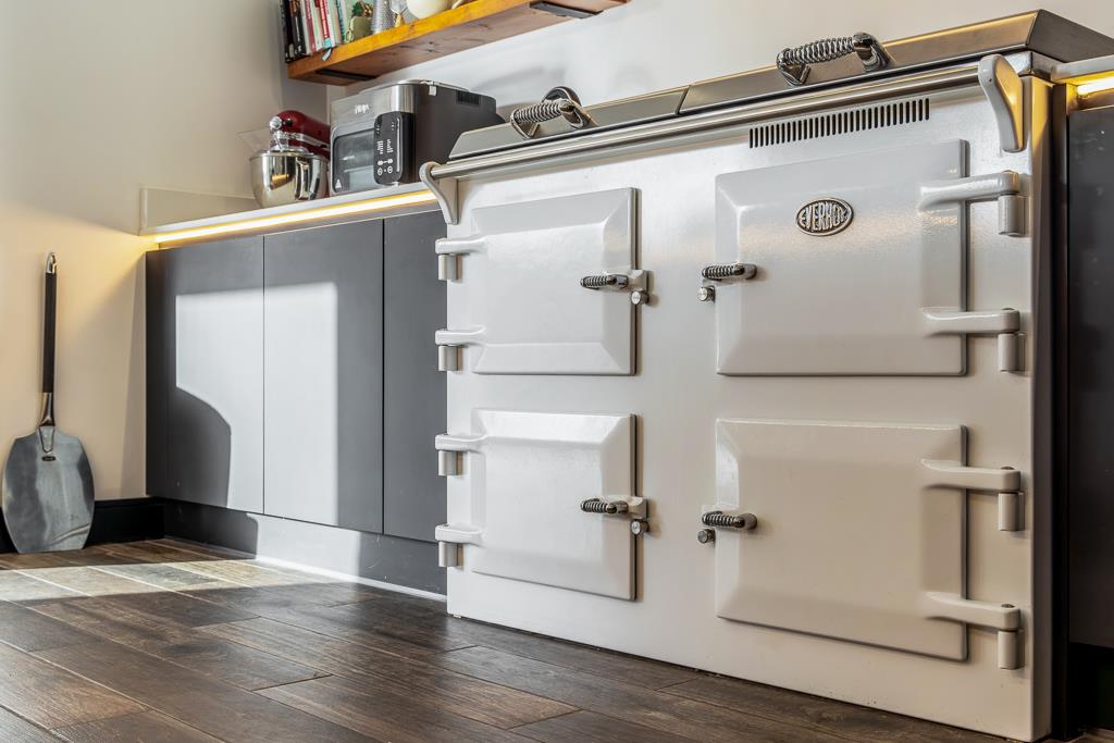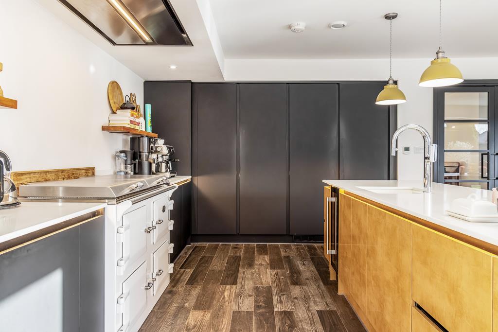 Freestanding Everhot range with induction hob and grill (negotiable not included in the price). Extractor fan. Built in pull out larder with shelving. Full height Neff freezer. Built in full height Neff fridge. Two tone island unit with storage under. Built in wine cooler. Sink inset with drainer and mixer tap. Built in AEG dishwasher. Tiled flooring.