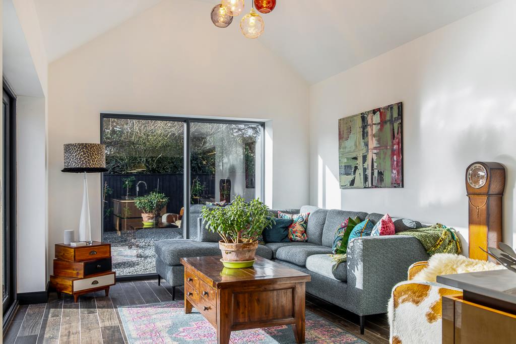 Vaulted ceiling. Slimline with Solar Neutral Sunguard sliding doors to garden. Large picture window to rear. Tiled flooring.