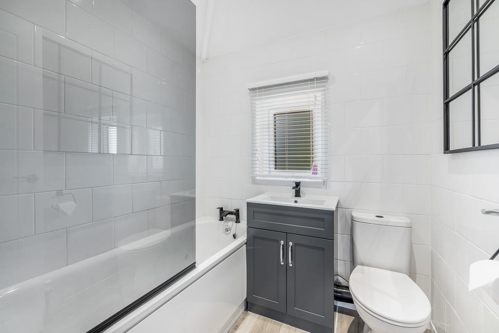 PVC double glazed window to front. Skimmed ceiling. Recessed spot lighting. Laminate flooring. Radiator. Fitted bath with mixer tap and electric shower. Close coupled toilet with push button flush. Ceramic wash hand basin with mixer tap set in vanity unit with built in storage.