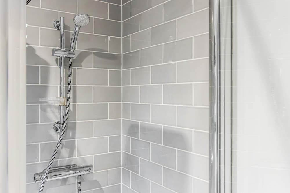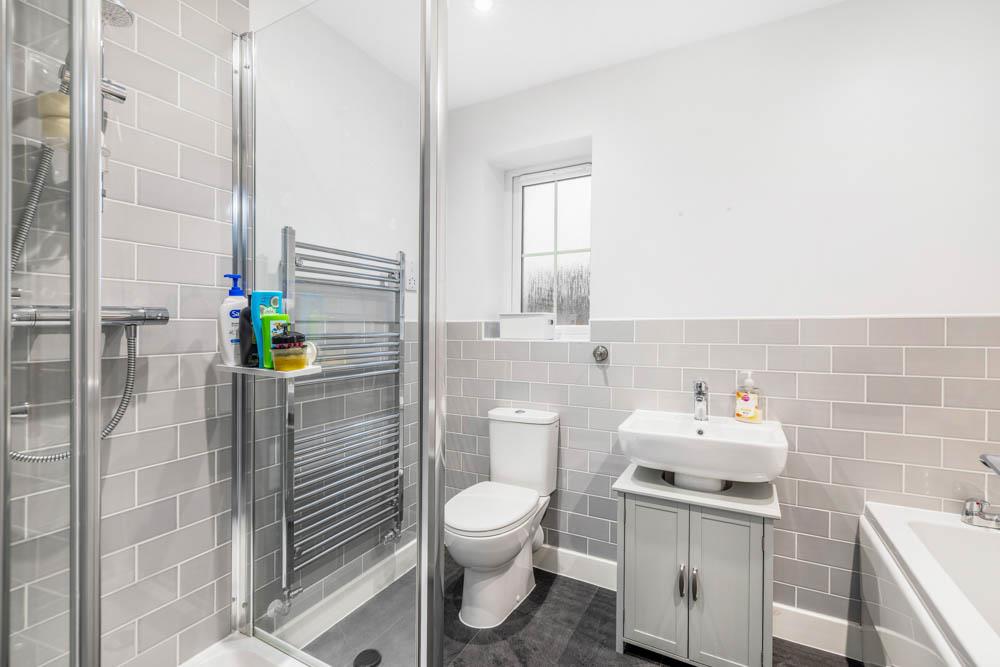PVC double glazed window to side. Skimmed ceiling. Recessed spot lighting. Fitted with a three piece suite comprising shower cubicle with glass door and thermostatic bar shower. Pedestal wash hand basin with chrome mixer tap . Close coupled toilet with push button flush. Chrome heated towel rail. Half height wall tiling. Shaver point. Extractor fan. Vinyl flooring.