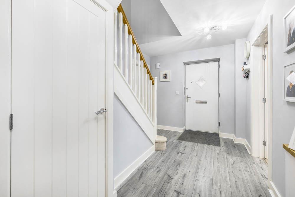 Composite glazed door to front. Radiator. Laminate flooring with matwell. Built in understairs storage cupboard. Stairs to first floor landing. Doors to lounge, dining room, WC and kitchen.