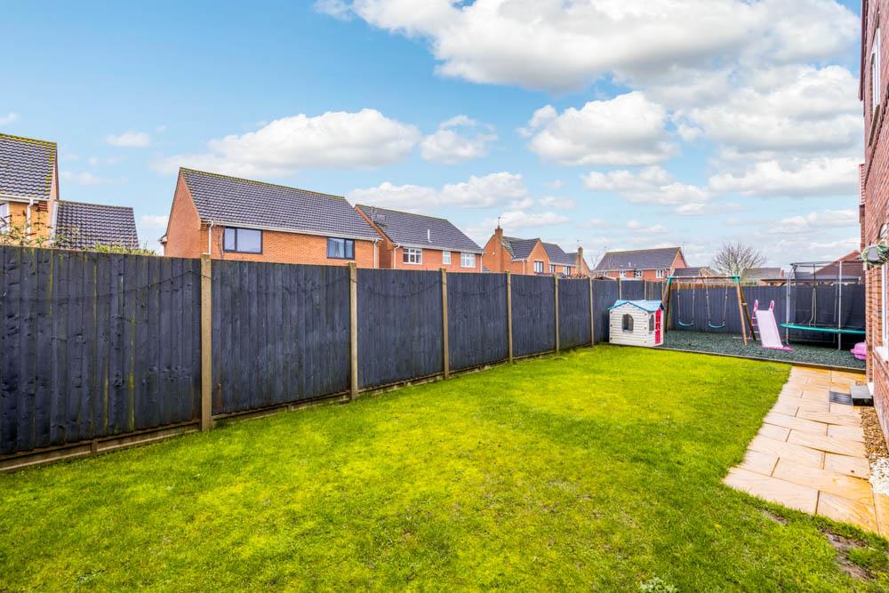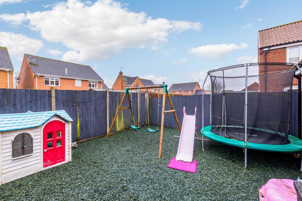 The rear garden is enclosed by timber fencing. Laid to lawn with patio seating area. Rubber mulch play area with swing set. Outside power and lighting. Outside cold water tap.