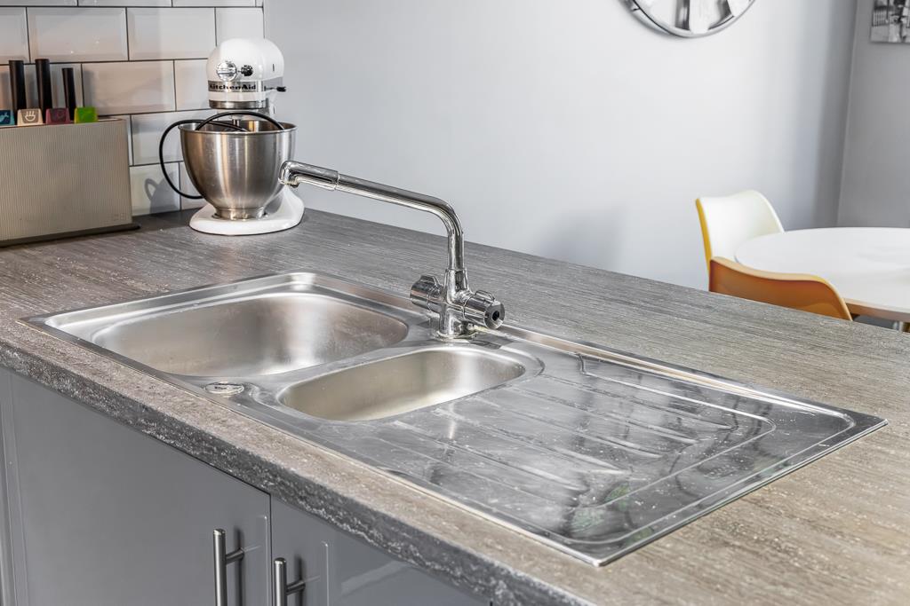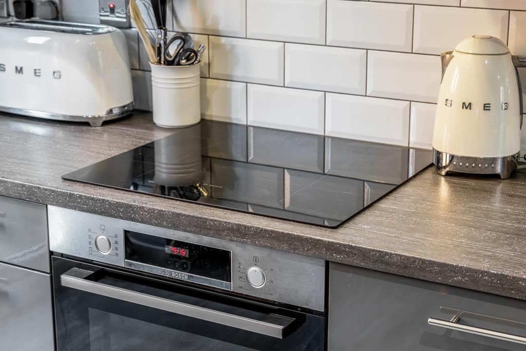 PVC double glazed window to front. French doors to rear. Skimmed ceiling. Laminate flooring. Radiator. Fitted with a matching range of base and eye level units with work surface and tiled splash back. Breakfast peninsular. Four ring Bosch induction hob with stainless steel extractor hood over. Electric oven and grill under. One and a half bowl stainless steel sink and drainer. Integrated dishwasher. Integrated fridge/freezer. Space and plumbing for washing machine and tumble dryer.