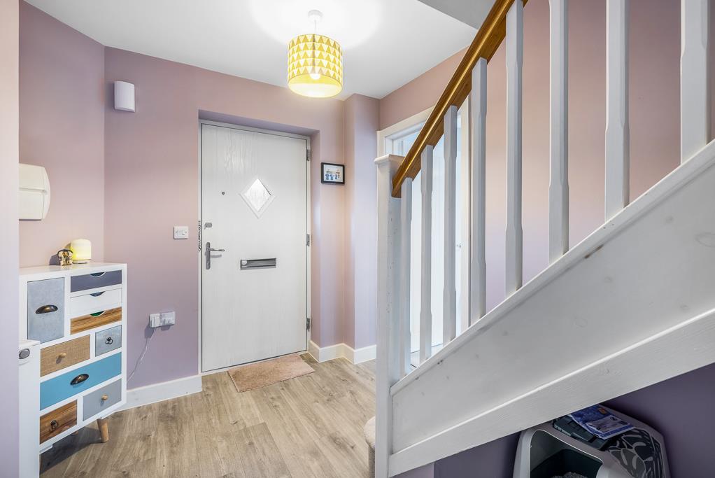 Composite glazed entrance door. Skimmed ceiling. Laminate flooring. Radiator. Wall mounted electric consumer unit. Stairs to first floor landing. Doors to lounge, cloakroom and kitchen/diner.