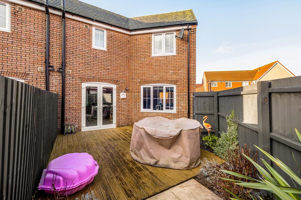 The rear garden is enclosed by timber fencing. Hard landscaped to include a generous decked seating area and further patio with planted borders. Outside light and water available.