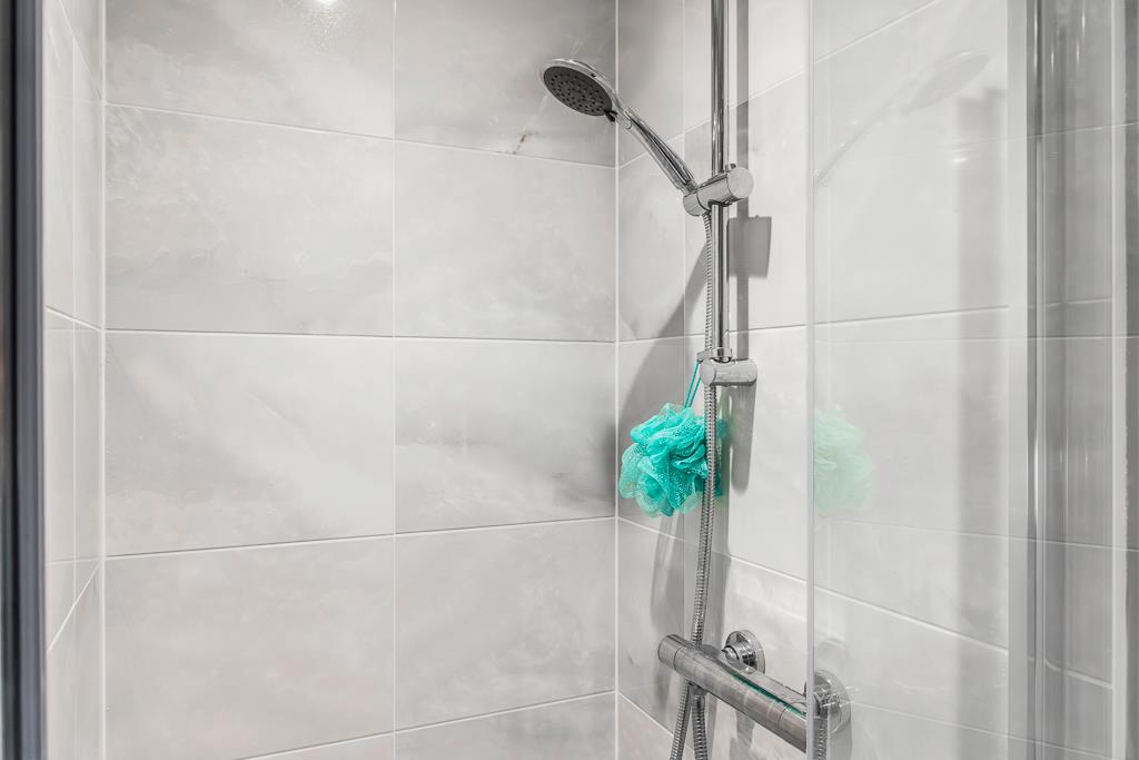 PVC double glazed window. Skimmed ceiling with recessed spot lights and extractor fan. Shaver point. Vinyl tile flooring. Chrome wall mounted heated towel rail. Tiled shower enclosure with glass door and thermostatic bar shower. Close coupled toilet with push button flush. Pedestal wash hand basin with chrome mixer tap and tiled splash back.