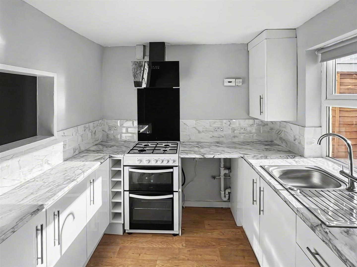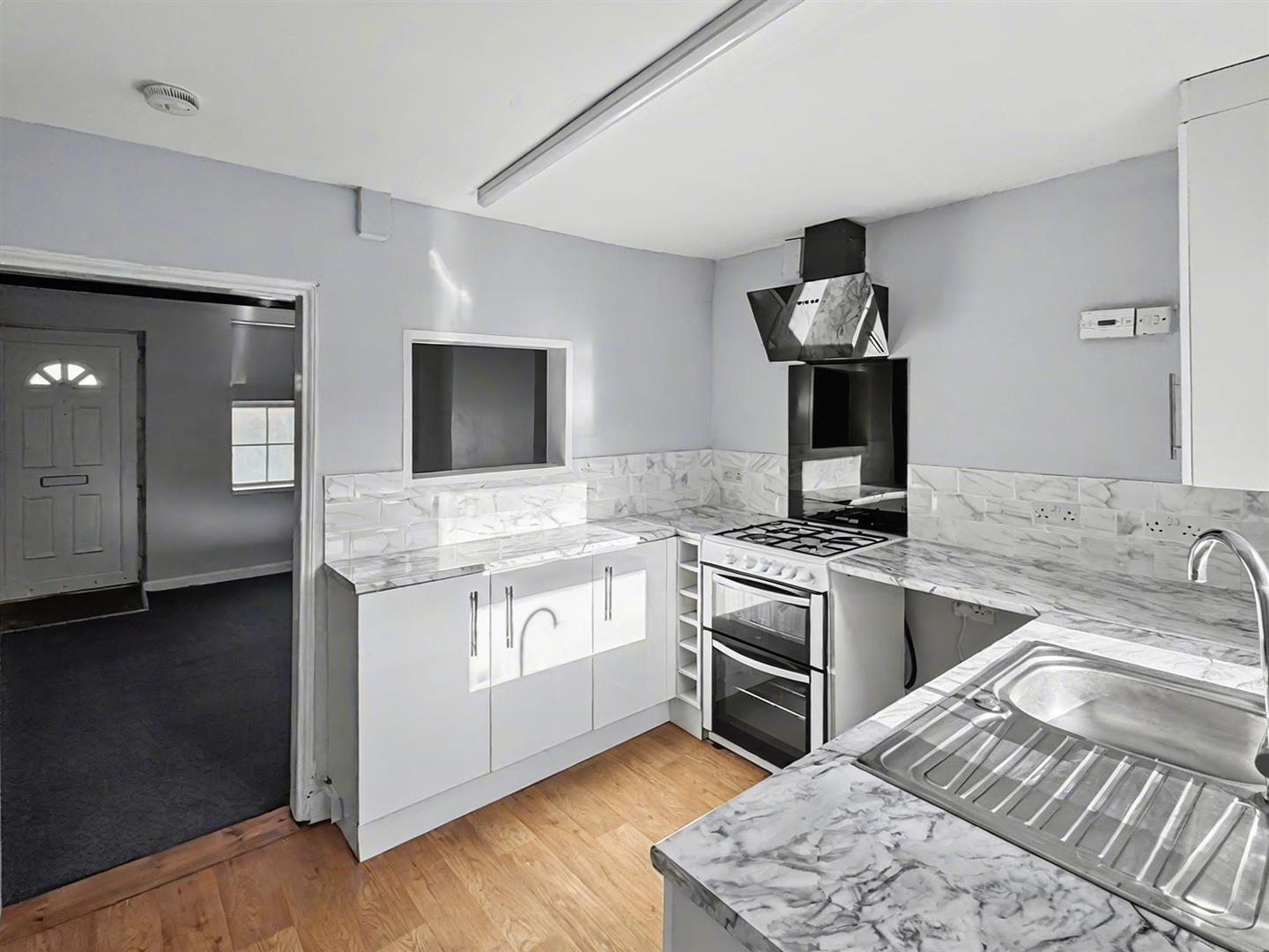Upvc double glazed window to rear elevation, stairs to first floor, base and wall units, freestanding cooker/hob, sink with mixer taps and space for washing machine.