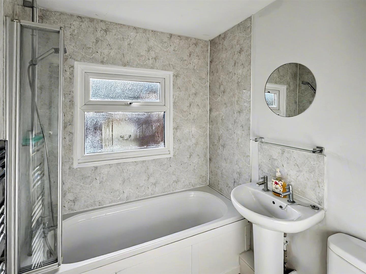 UPVC double glazed window to rear elevation, heated towel rail, three piece suite comprising of wc, wash hand basin and bath.